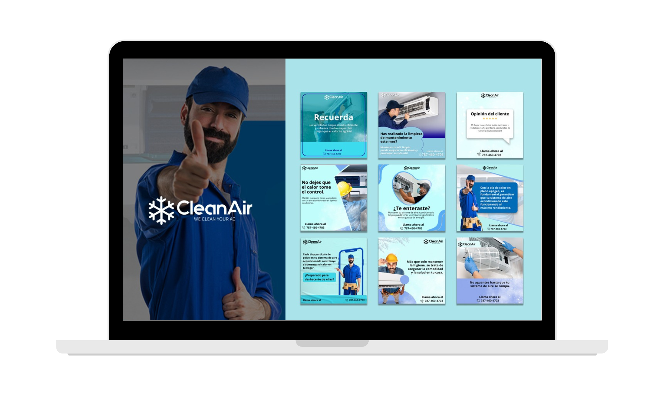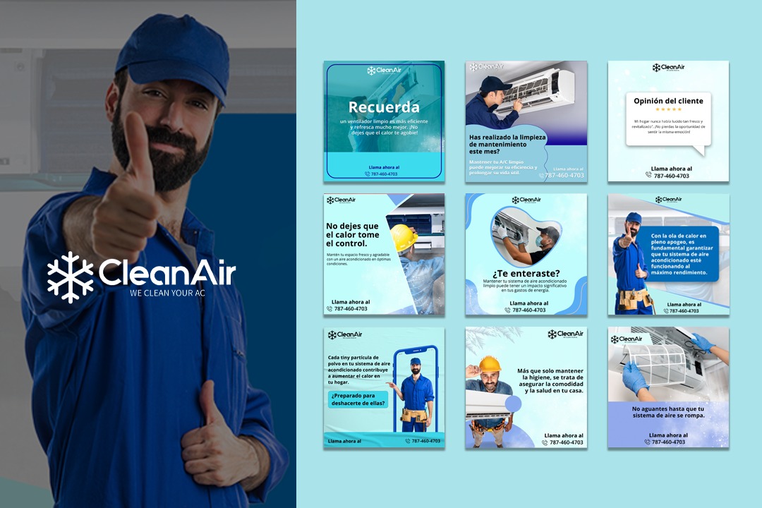 With CleanAir, we educated on the why of by educating about the importance of having regular AC maintenance done and discussing the benefits of a clean air system. We generated a content calendar that featured a spread of captivating posts—such as customer testimonials, maintenance reminders and why air quality matters. Each post consisted of a beautifully crafted visual, and included the brand’s corporate colors and bold, easily digestible content. Some posts featured the need to clean AC units, prevent heat build up and increase airflow – complete with clear calls-to-action to contact CleanAir and book a maintenance service.